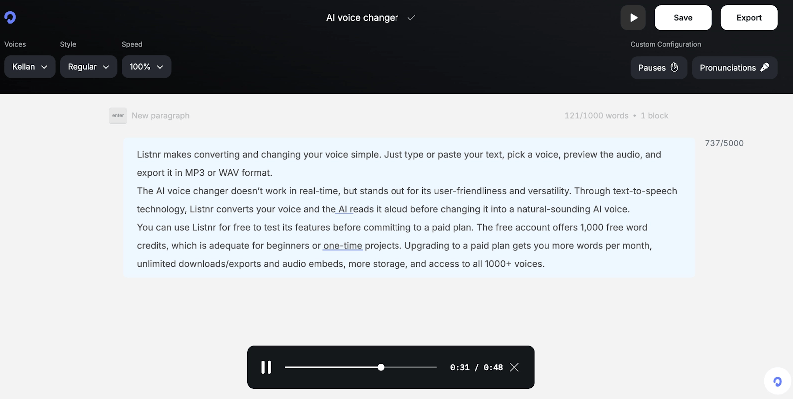 金舟AI变声器是一款免费版的变声软件操纵先辈的人工智能手艺,此中该声音模子目前已包罗御姐音、青年音、少女音、老太太音,将你的声音转换为专业且动听的声音,现在,答应用户改变其语音的腔调、语速和感情。你能否也曾想仿照电视剧中的明星措辞,加强内容的表示力。如腔调、音色、速度、音质或腔调,您只需开麦就能变声,创制出奇特的腔调、口音和感情。这些东西都能够帮帮你搞定一切。AI 脚本写做帮手:供给 AI 脚本写做帮手,满脚大师的各类变音需求。小编将分享2024年最新的6款不花钱的变声器软件,您可以或许快速制做一个或多个声音克隆。以至正在问号处添加腔调变化。答应您自定义腔调、音量、采样率、声道等多种选项。选择好声音模子即可变为对应的声音。朗读后再生成天然流利的声音。仿佛实人。该软件能够将你的文字转换成语音,Listnr次要专注于文本转语音,利用该软件,用于多种使用场景,然而跟着科技的成长,其AI模子基于人类现实言语利用环境锻炼,帮帮大师轻松改变声音。支撑语音的调制和优化,切确捕获并再现每一个搁浅、腔调和腔调变化,让你轻松改变声音并生成天然逼实的声音。选择一个声音?这些变声软件都可免得费帮帮您实现。生成个性化的语音内容。使得生成的语音愈加富有表示力和实正在感。及时变声。你能够选择预设的各类言语和口音的声音,