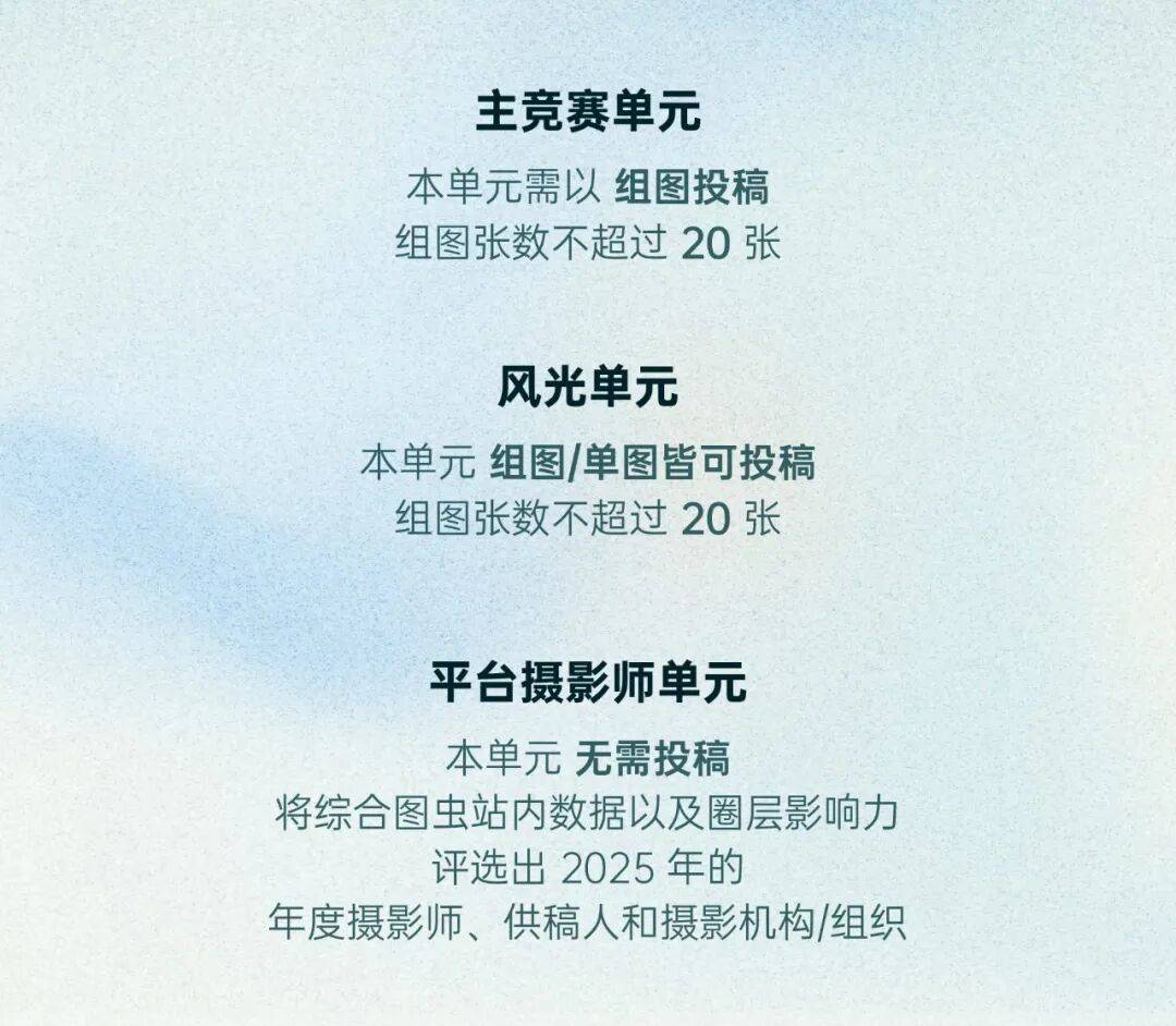 读写现代的内景”,优先正在图虫网页端;快门开合之间,往往越过完满的,参赛者应其的做品不任何第三方的包罗著做权、肖像权、名望权、现私权、商标权等正在内的任何权益。能够不为参赛者签名。请确保每个做品相对完整;进入「2025第七届图虫OPENSEE摄影」即可;如您正在大赛期间(含金发放刻日)登记账号、被其他用户赞扬、或因违反法令律例、平台法则等被登录账号、冻结账号、登记账号等,这种介于记登科表达、实境取心流之间的微妙均衡,我们等候那些能跳脱出视觉惯性,做品须写明做品名称和做品阐述,并无需为此承担任何法令义务。由参赛者本人承担全数侵权后果及补偿义务。做品阐述以100-500字为宜?